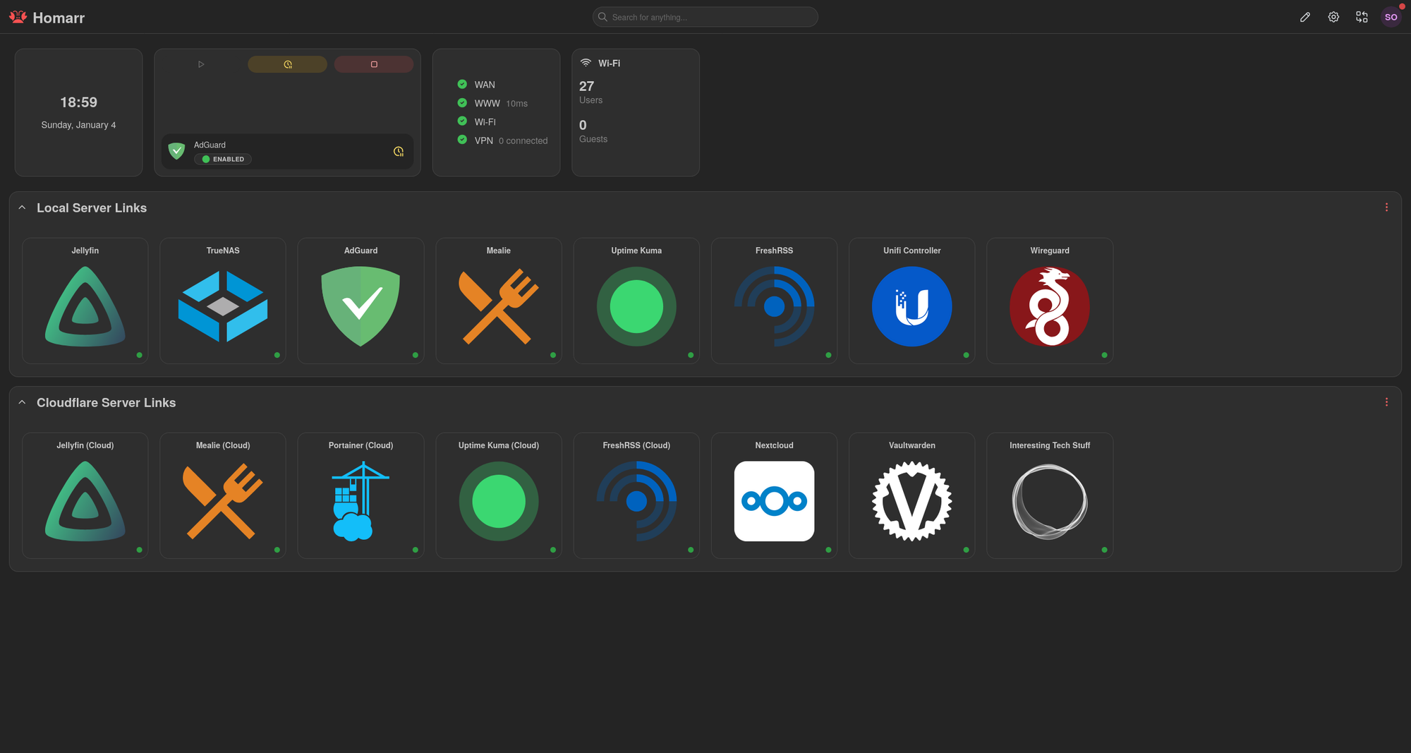 Staying in the thought about not remembering what you are hosting at any given time, this is the solution. Homarr is a dashboard that can have shortcuts to any website, mainly focused on self-hosted sites. It also has a built-in search bar that supports custom search engines and support for many integrations. I use integrations with AdGuard DNS and the Unifi Network app.